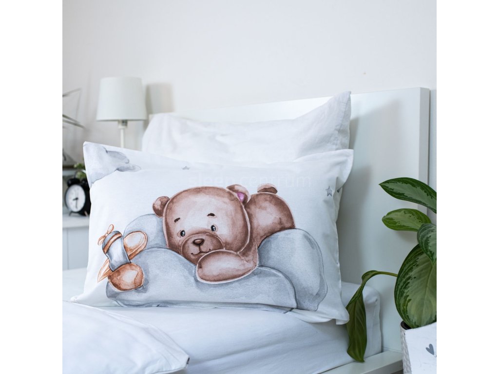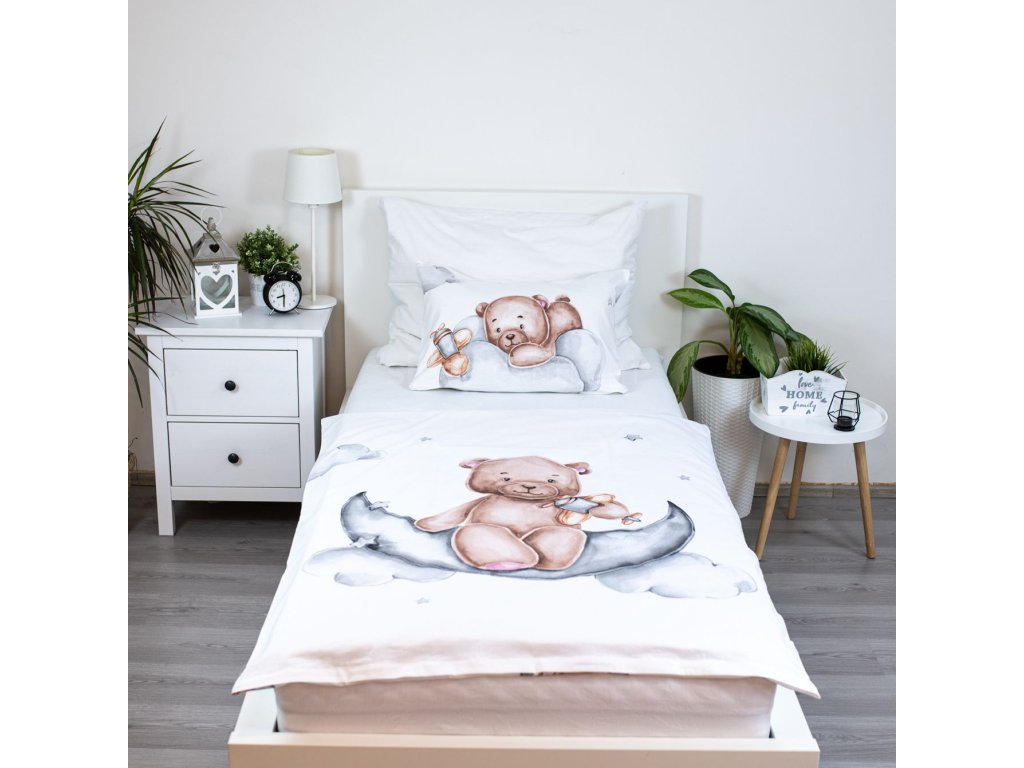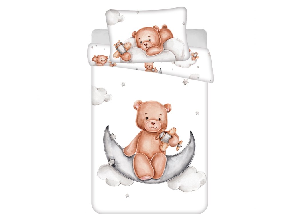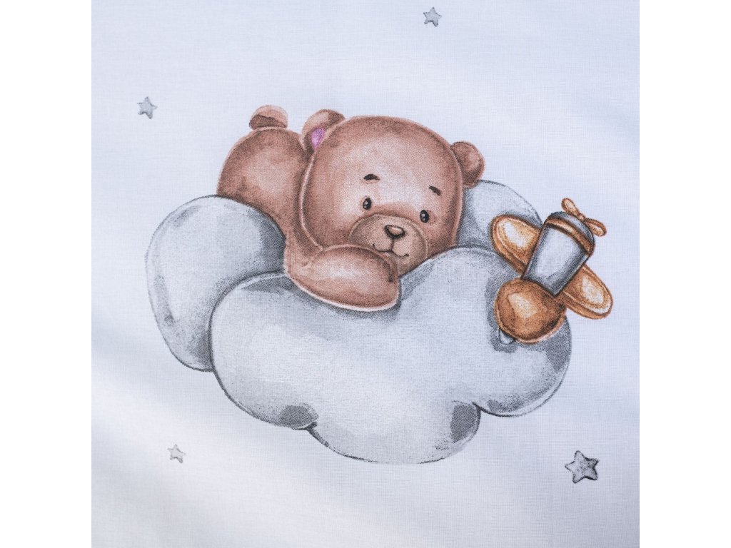 Na jedné straně přikrývky se vyjímá roztomilý medvídek sedící na měsíci, v obláčcích a s malým letadélkem v tlapkách, který vypadá, jako by se chystal na výlet do snového nebe. Druhá strana povlečení je zdobena opakujícím se motivem medvídků s letadélky a obláčky, díky čemuž působí celkový vzhled harmonicky a hravě. Polštář doplňuje motiv medvídka odpočívajícího na obláčku, který ladí s hlavním motivem přikrývky a dodává celé sadě pohádkový nádech.