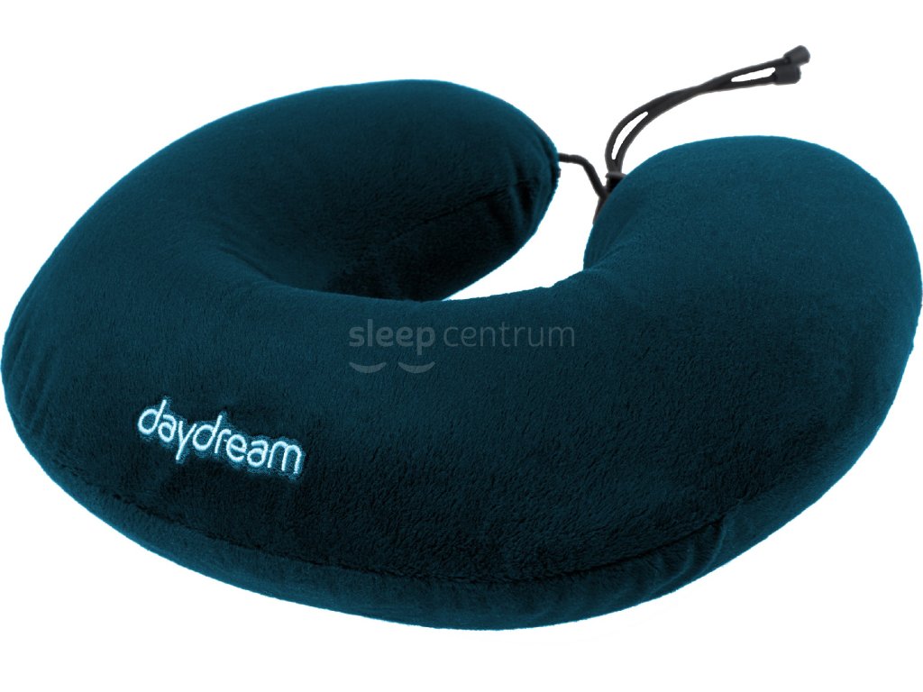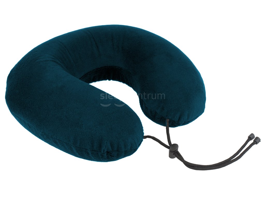 Cestovní polštář na podporu krční páteře z líné paměťové pěny v petrolejové barvě se zaoblenějšími konci.