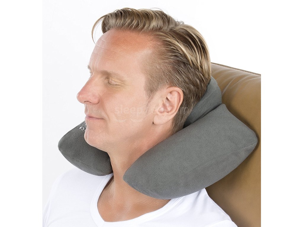 Šedý nafukovací cestovní polštář s patentovaným tvarem, který je ideální pro podporu hlavy.