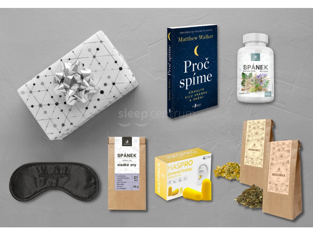 Produkty v balíčku jsou pečlivě vybírány tak, aby vašim nejbližším pomohly vylepšit jejich spánek. Uvaří si kvalitní čaj, posadí se do křesla a přečtou si o tom, jak mohou zkvalitnit svůj spánek. S usínáním jim pak pomohou tablety s bylinným extraktem, oblíbená maska na spaní Daydream a špunty do uší poskytnou klid a dokonalou tmu.