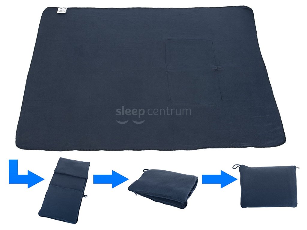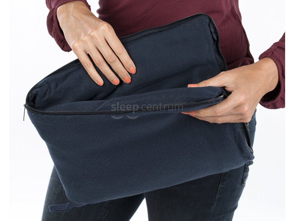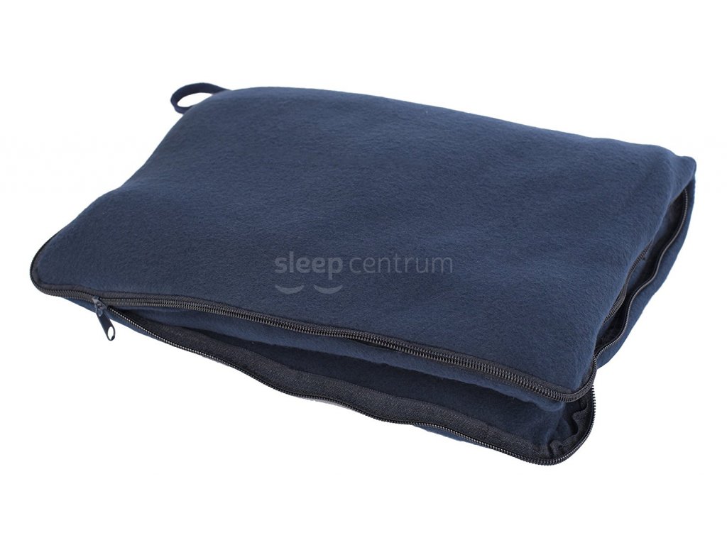 Praktická cestovní deka, kterou lze přeměnit na polštář v modré barvě. Rozepnutím zipu získáte během chvilky praktickou deku v rozměru 120 x 170 cm, složením deky do původního tvaru a uzavřením zipového uzávěru můžete produkt použít jako polštář.