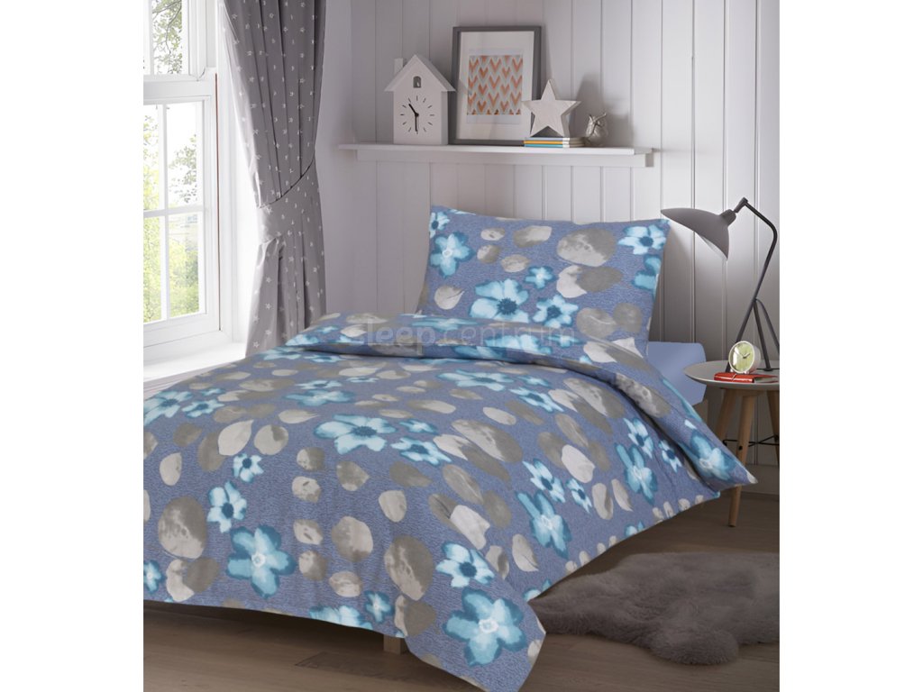 Dezén Modrý sen kombinuje romantické květy v odstínech světle a tyrkysově modré s jemnými šedými kruhy na tmavším podkladu. Výsledek působí útulně, moderně a navodí příjemnou, klidnou atmosféru pro váš spánek.