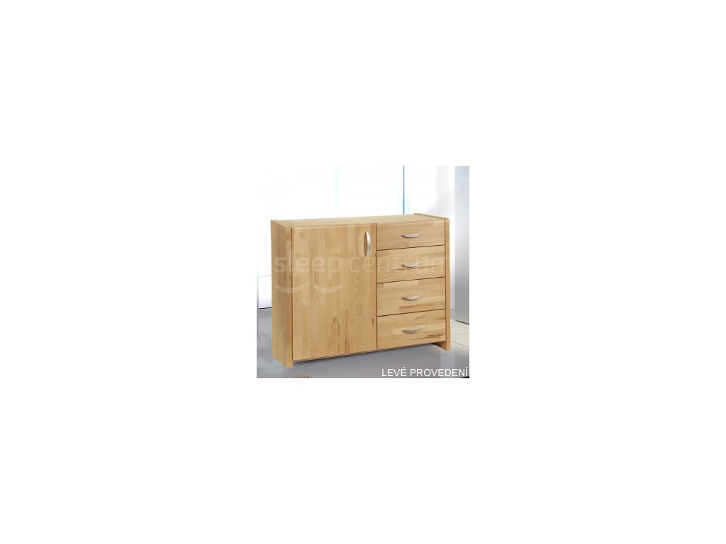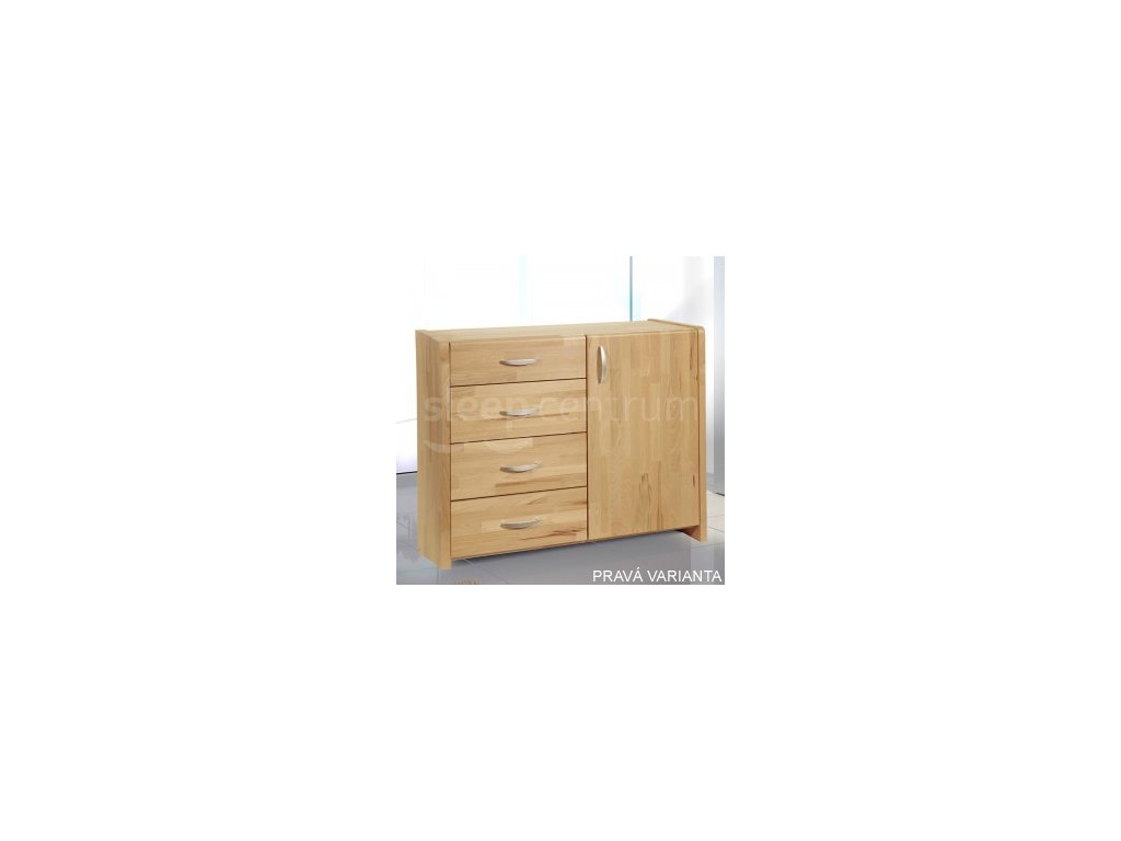 Komoda od českého výrobce Vykona z kvalitního masivního jádrového buku. Komoda je opatřena čtyřmi zásuvkami s celovýsuvným pojezdem, který zajistí vysunutí zásuvky do celé její hloubky. Po jedné straně komody jsou umístěna dvířka, za kterými jsou umístěny dvě police. Pravé provedení komody má dvířka umístěna vpravo, levé provedení komody má dvířka umístěna vlevo. Přední strana vrchní desky i horní rohy mají zaoblenou hranu. Komoda je dodávána ve smontovaném stavu.