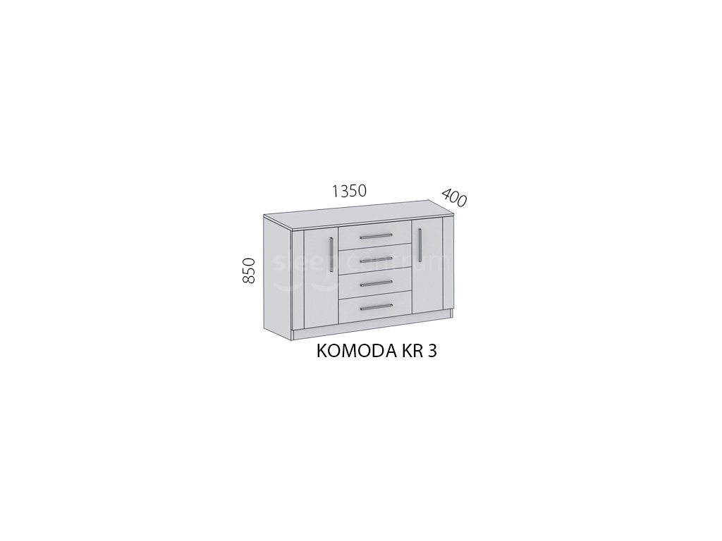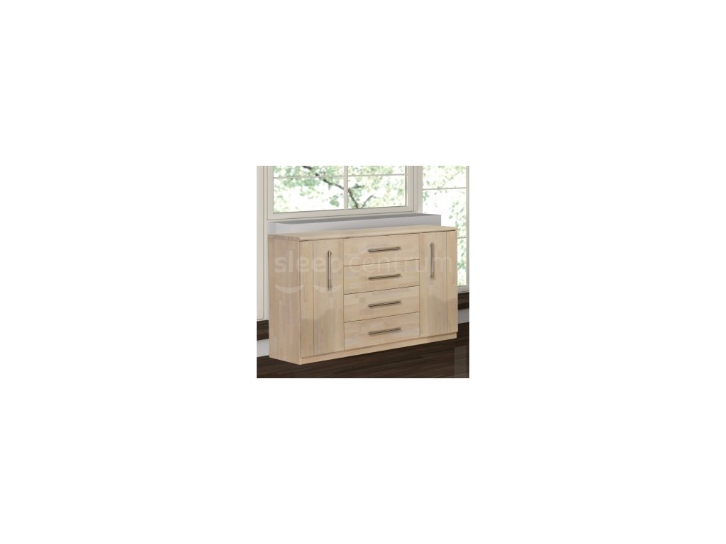 Komoda od českého výrobce Vykona z kvalitního masivního jádrového buku. Komoda je opatřena uprostřed čtyřmi zásuvkami s celovýsuvným pojezdem, který zajistí vysunutí zásuvky do celé její hloubky. Po obou stranách komody jsou umístěna dvířka, za kterými jsou umístěny dvě police. Na každé straně má komoda vyfrézovanou ozdobnou drážku. Přední strana vrchní desky má zaoblenou hranu. Komoda je dodávána ve smontovaném stavu.