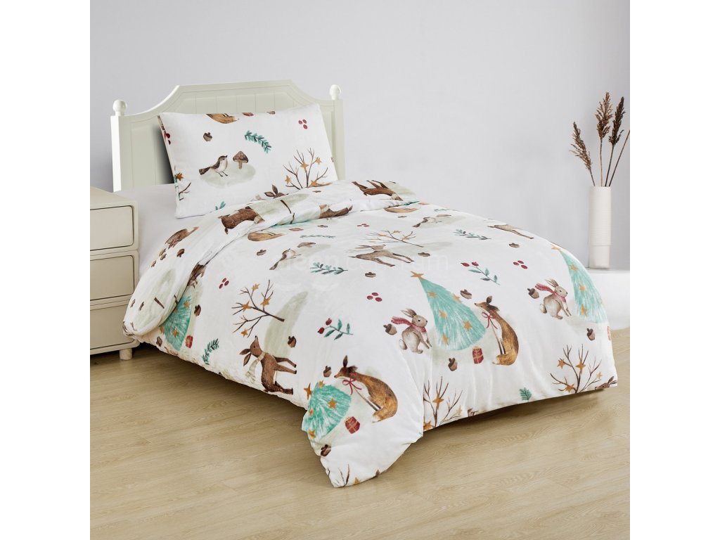 Povlečení Vánoce v lese z mikroplyše vás přenese do zasněžené zimní pohádky. Roztomilé ilustrace lesních zvířátek, stromů a drobných vánočních motivů na bílém podkladu v jemných tónech hnědé, zelené a červené vytvoří pocit tepla, bezpečí a radosti z domácího pohodlí.