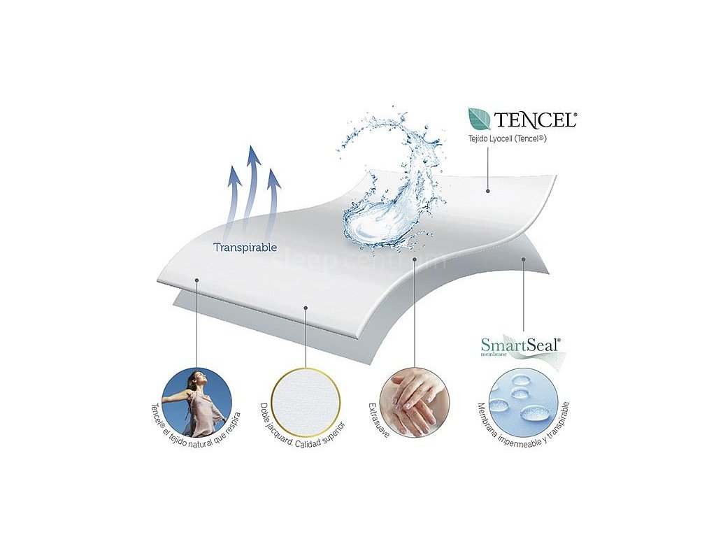 Vrchní materiál chrániče se skládá z dvojité žakárové látky - 40 % Tencel a 60 % polyester. Pod touto vrstvou se nachází extra prodyšná PU membrána SmartSeal.